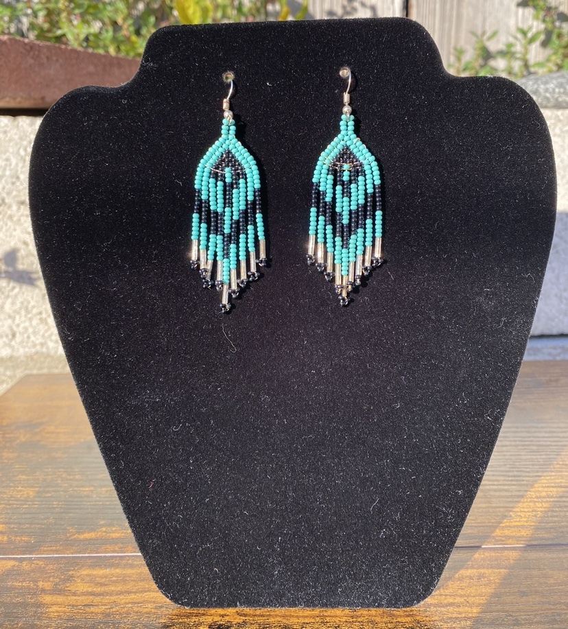 Teal and Black Hand Beaded Fringe Earrings 2 Inch