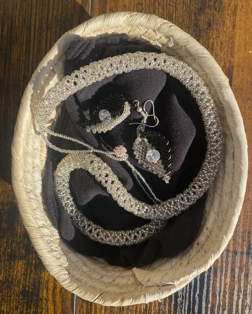A silver chocker necklace, paired with black and white silver earrings.