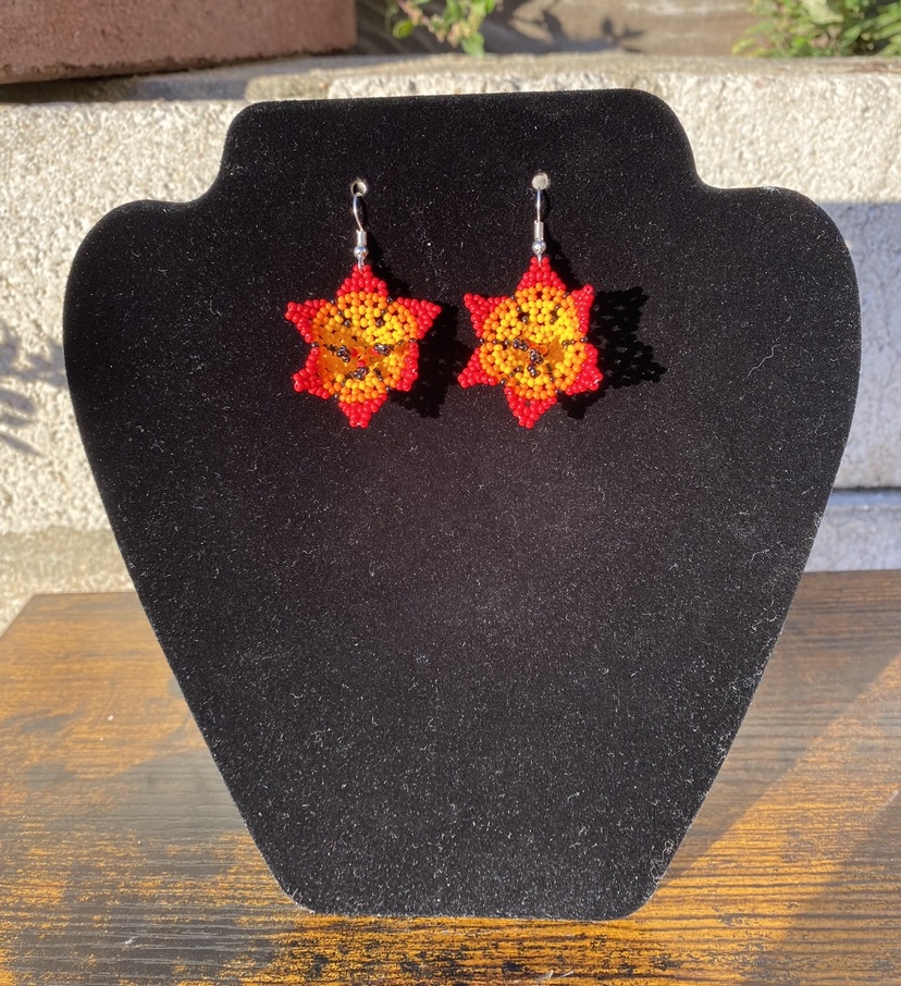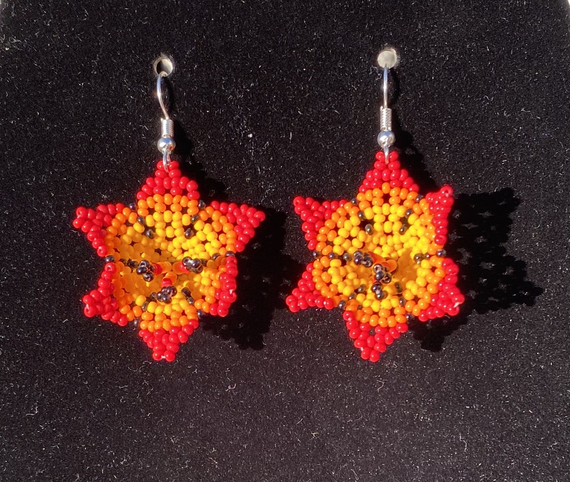 Red Hand Beaded Flower Earrings with Yellow Accents 1.5 Inch