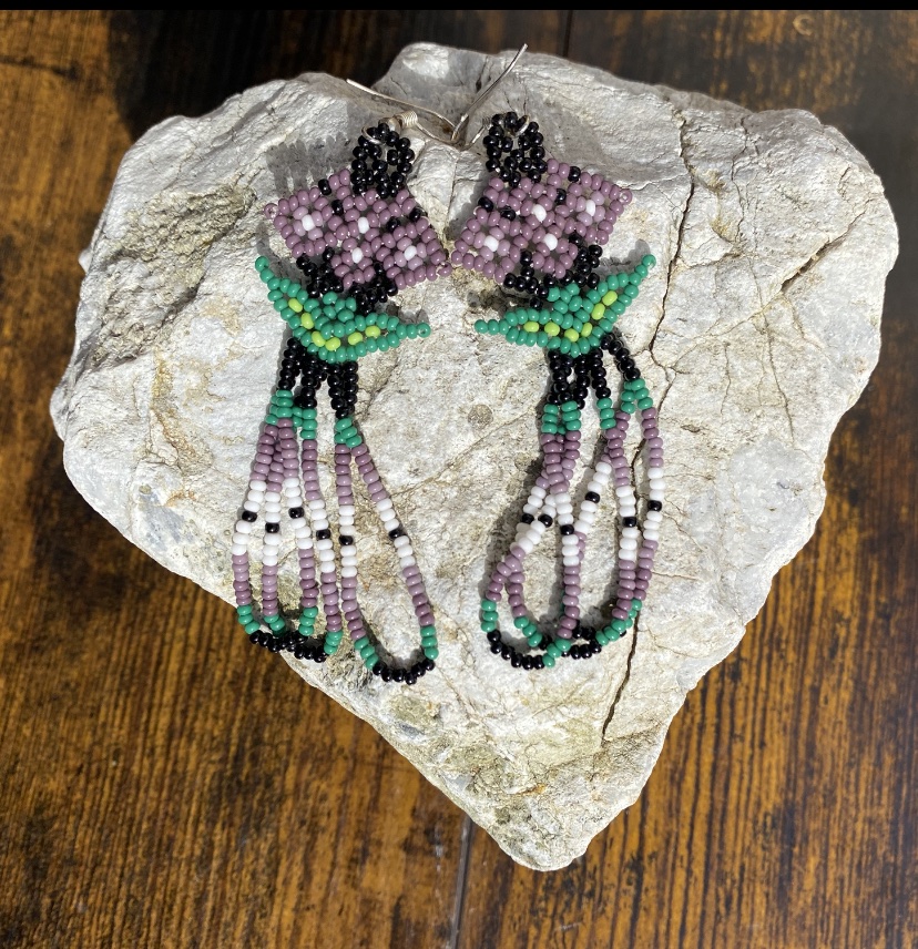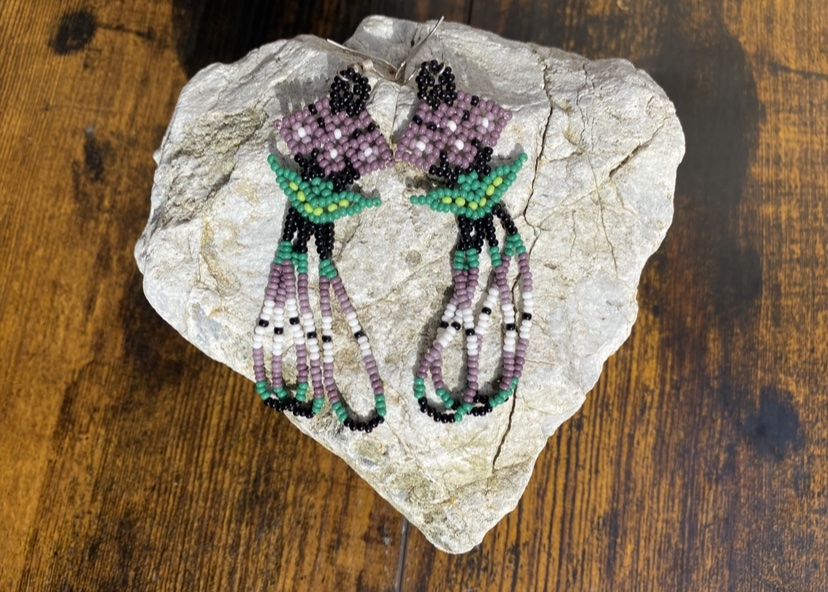 Purple & Black Hand beaded Dangle Flower Earrings 3 Inch